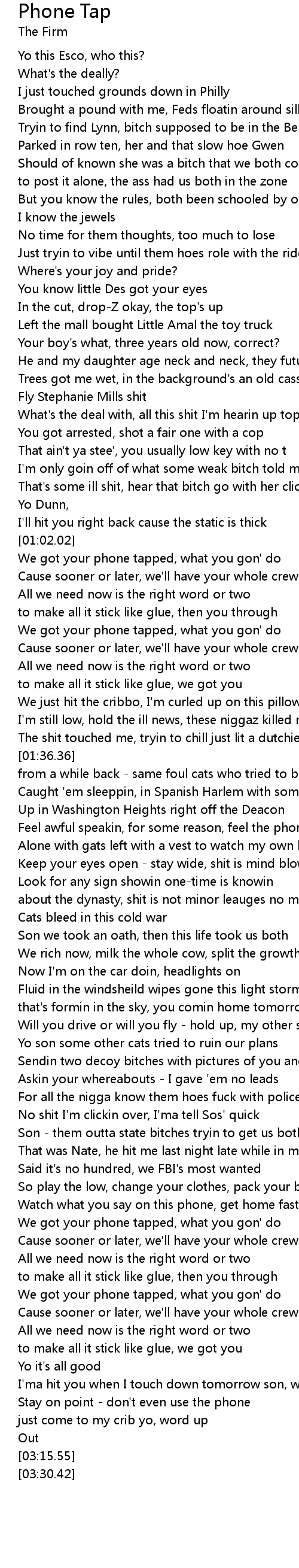 | [01:44.54] | Feel awful speakin, for some reason, feel the phone's tapped |