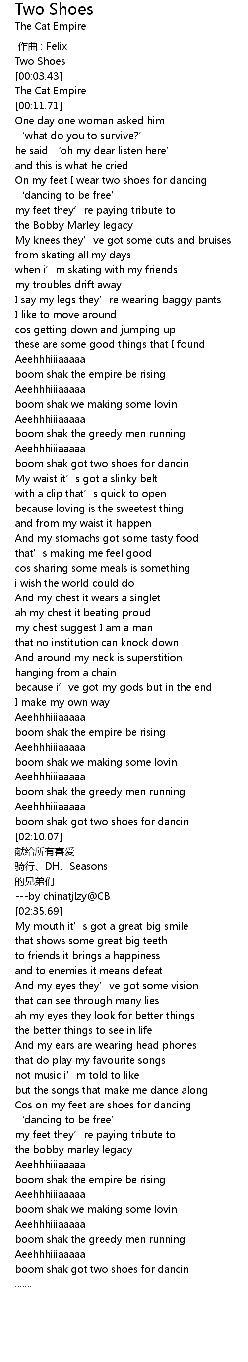 | [03:37.13] | Cos on my feet are shoes for dancing |