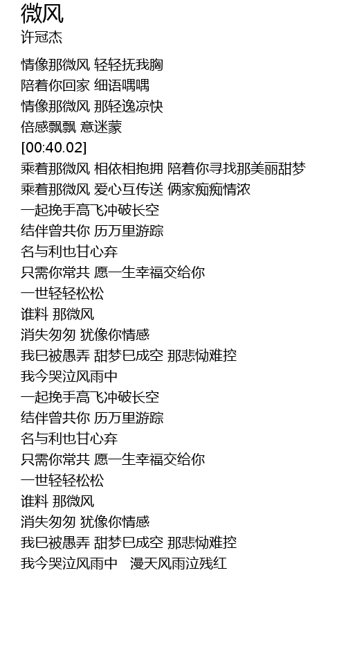 | [00:15.80] | 情像那微风 轻轻抚我胸 |