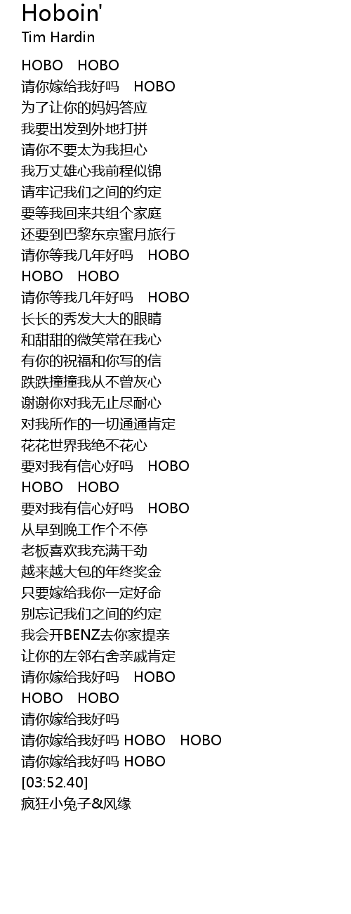 | [02:57.64] | 请你嫁给我好吗 HOBO HOBO |