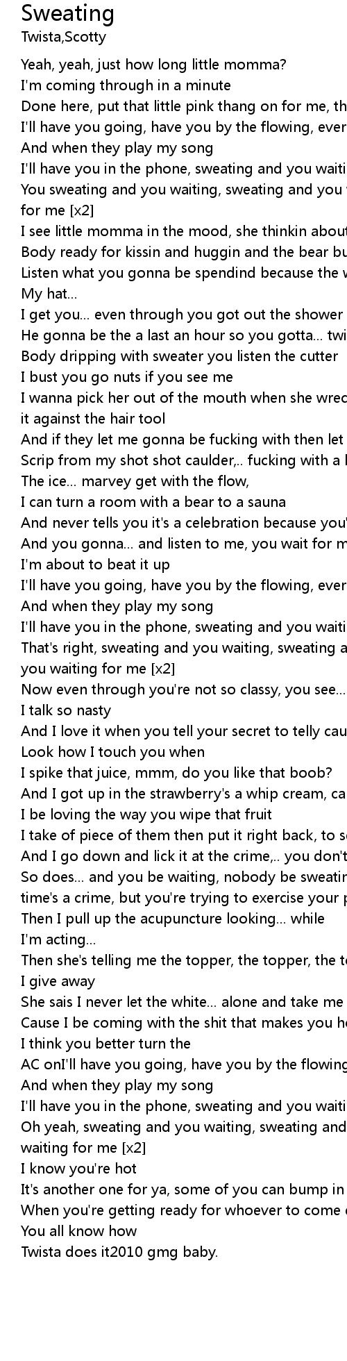 | Oh yeah, sweating and you waiting, sweating and you waiting, sweating and you waiting for me [x2] | |