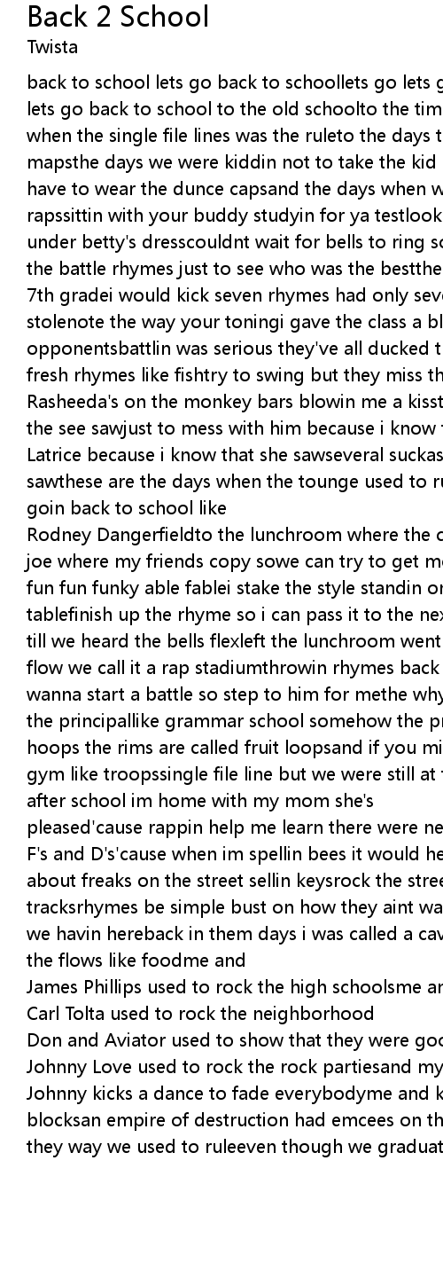 [Tung Twista]back to school lets go back to schoollets go lets go back to school to the oldschool[chorus 4x]lets go back to school to the old schoolto the times when the single file lines was the ruleto the days that we had to study all the mapsthe days we were kiddin not to take the kid napsthe days when we used to have to wear the dunce capsand the days when we used to bust the oldschool rapssittin with your buddy studyin for ya testlookin back so that you see up under betty's dresscouldnt wait for bells to ring so we can go to recessto kick the battle rhymes just to see who was the bestthere were seven emcee's in the 7th gradei would kick seven rhymes had only seven madebut those seven rhymes we stolenote the way your toningi gave the class a blast the way i smash my opponentsbattlin was serious they've all ducked the fistbecause i kick the funky fresh rhymes like fishtry to swing but they miss they miss like this |