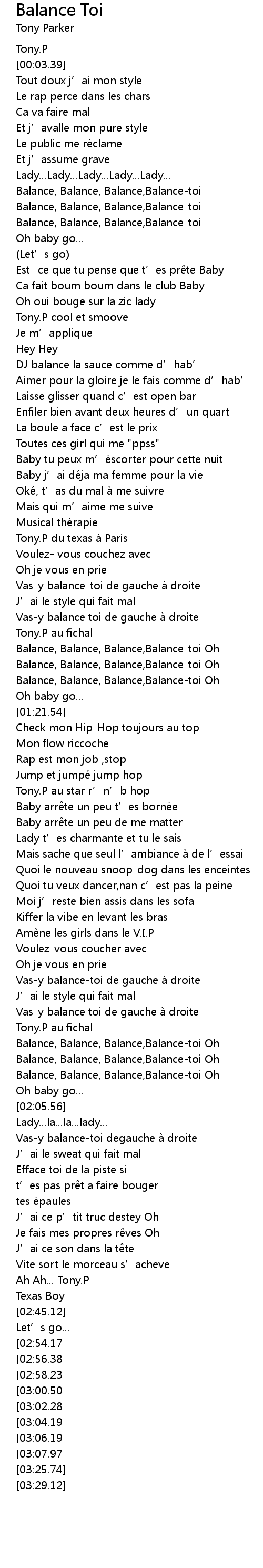 | [01:01.86] | Tony. P du texas à Paris |