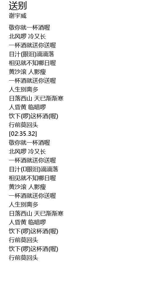 | [03:34.36] | yī bēi jiǔ jiù sòng nǐ sòng ō |