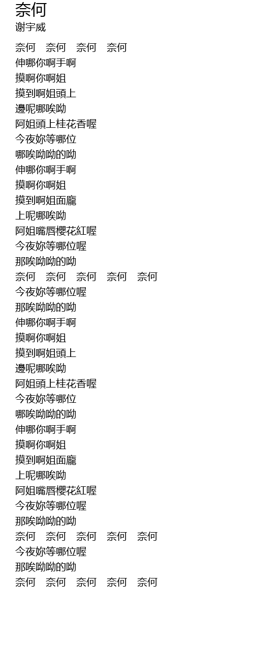 | [03:53.18] | 奈何 奈何 奈何 奈何 奈何 |