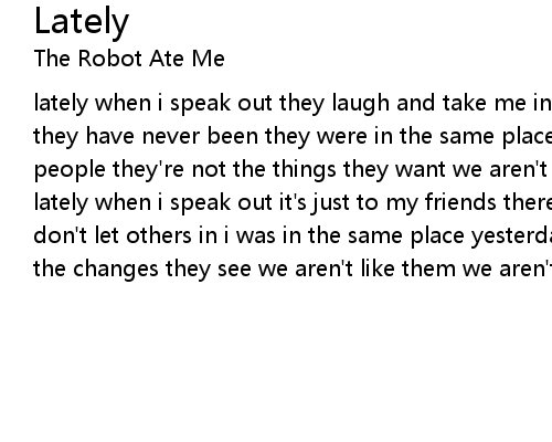 | lately when i speak out they laugh and take me in they send me off to places they have never been they were in the same place yesterday talking about the people they're not the things they want we aren't like them we aren't like them lately when i speak out it's just to my friends there isnt hope for us if you we don't let others in i was in the same place yesterday hoping for people to be the changes they see we aren't like them we aren't like them |