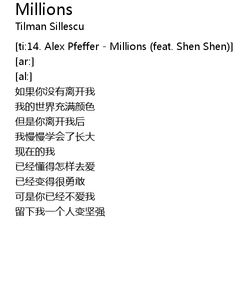 | [ti:14. Alex Pfeffer - Millions (feat. Shen Shen)] | |