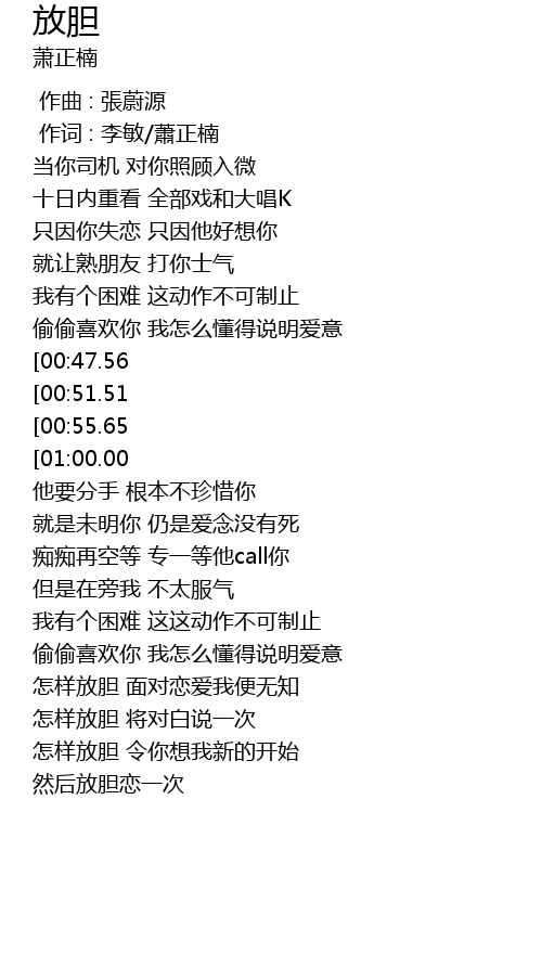 | [01:48.98][00:47.56] | 怎样放胆 面对恋爱我便无知 |