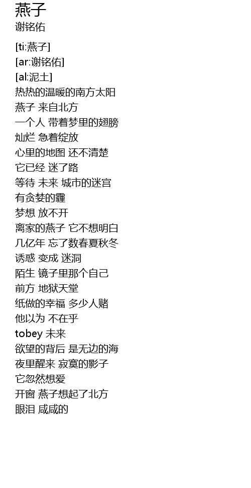 | [01:15.51] | 离家的燕子 它不想明白 |