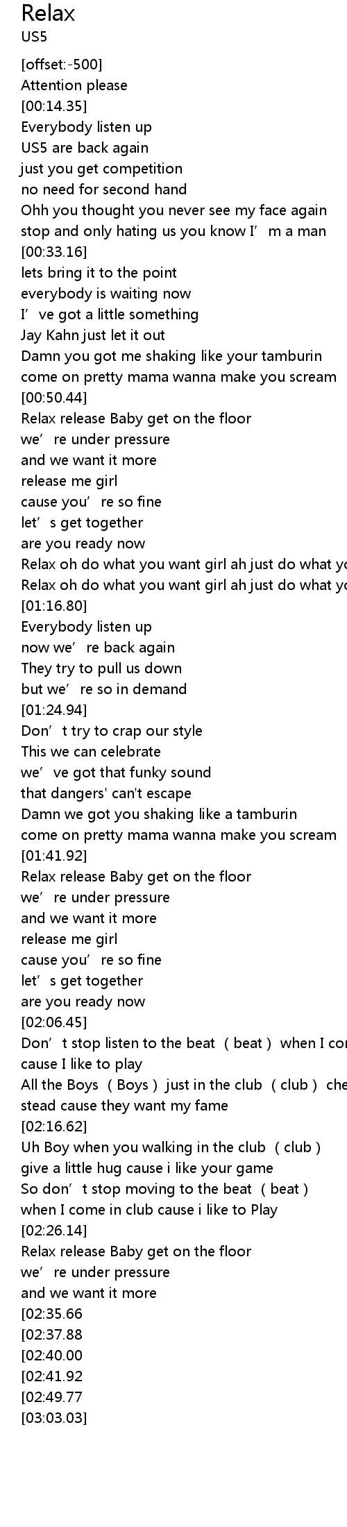 | [03:00.67][02:49.77][02:47.69][02:45.41][02:43.58] | Relax |