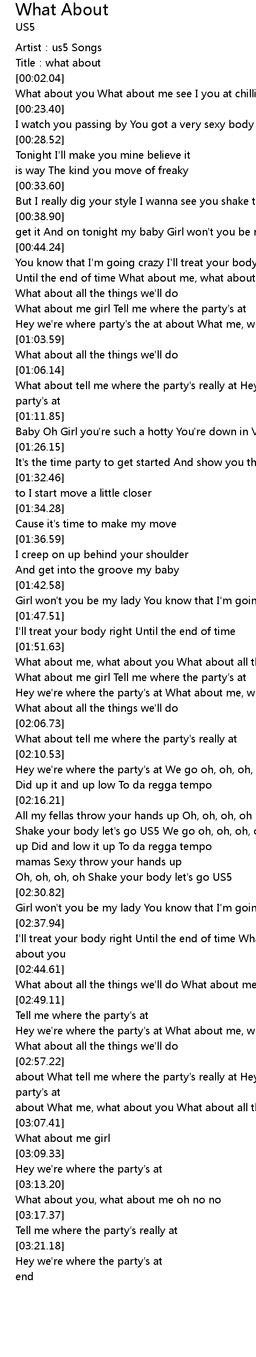 | [01:00.34] | Hey we're where party's the at about What me, what about you |