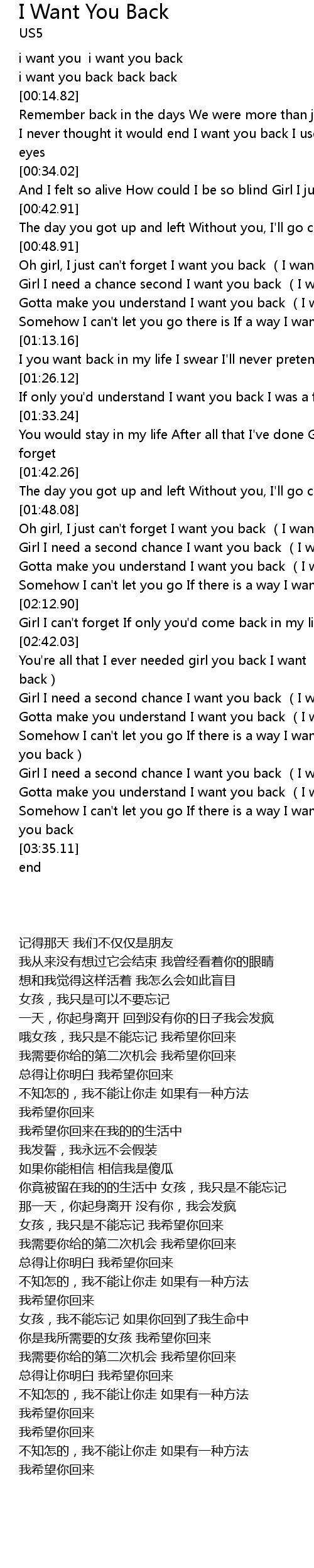 | [00:56.32] | Girl I need a chance second I want you back (I want you back) |
