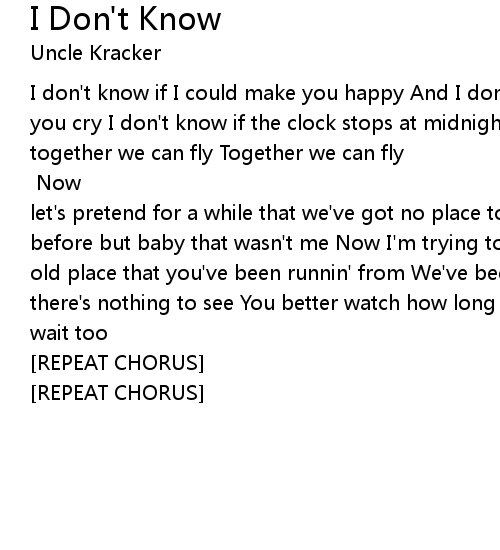 | [ From: http://www.metrolyrics.com/u-dont-know-lyrics-uncle-kracker.html ] Now let's pretend for a while that we've got no place to be You've been broken before but baby that wasn't me Now I'm trying to ask you to come To that same old place that you've been runnin' from We've been down that road You know there's nothing to see You better watch how long you wait Cuz baby you might wait too | |