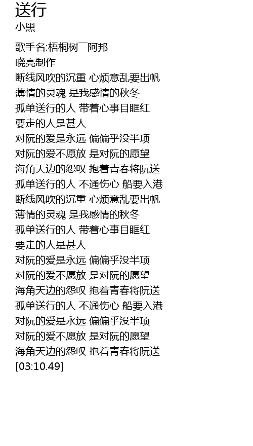 | [03:03.68] | 海角天边的怨叹 抱着青春将阮送 |