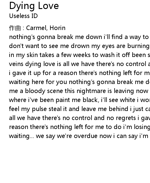| nothing's gonna break me down i'll find a way to bury you within the past you don't want to see me drown my eyes are burning every tear a memory your perfume in my skin takes a few weeks to wash it off been so hard cutting you out of my veins dying love is all we have there's no control and no regrets i gave it all i gave it up for a reason there's nothing left for me to do i'm losing it waiting here for you nothing's gonna break me down the twisted life you've given me a bloody scene this nightmare is leaving now recover from this mental health where i've been paint me black, i'll see white i won't be calling you tonight feel my pulse steal it and leave me behind i just can't take it dying love is all we have there's no control and no regrets i gave it all i gave it up for a reason there's nothing left for me to do i'm losing it waiting here for you i'm waiting... we say we're overdue now i can say i'm over you |