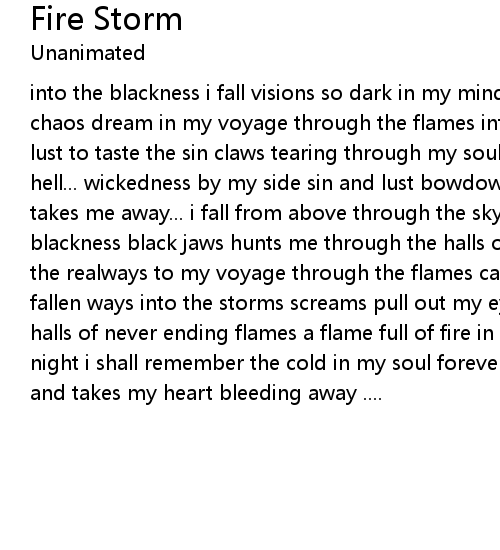 into the blackness i fall visions so dark in my mind they call chaos scream chaos dream in my voyage through the flames into my flesh they crawl emotional lust to taste the sin claws tearing through my soul i cried take me down to hell... wickedness by my side sin and lust bowdown before me storms of fire takes me away... i fall from above through the sky thrown away into the blackness black jaws hunts me through the halls of never ending pain in pain of the realways to my voyage through the flames calls of rise in my glaceless fallen ways into the storms screams pull out my eyes black roars hunts me to the halls of never ending flames a flame full of fire in a stillness but cold as night i shall remember the cold in my soul forever more as the storms screams and takes my heart bleeding away ....