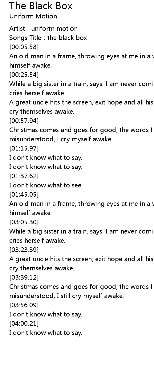 | [00:43.52] | A great uncle hits the screen, exit hope and all his dreams and they cry themselves awake. |