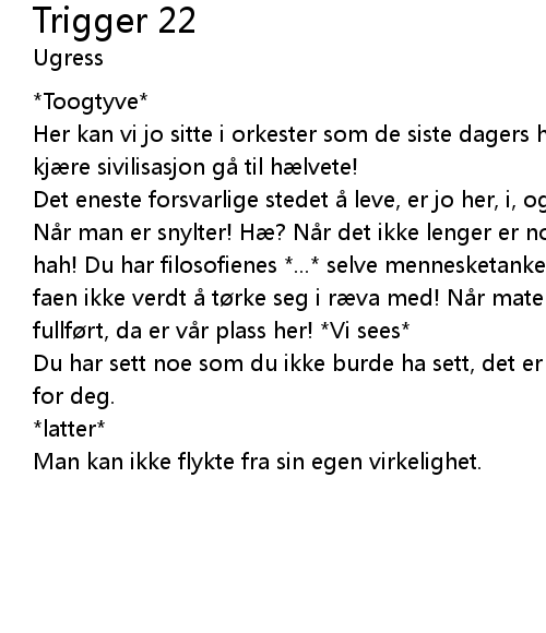 | Det eneste forsvarlige stedet leve, er jo her, i, og av menneskenes avfall! N r man er snylter! H? N r det ikke lenger er noen ideologiske d rer pne, hah! Du har filosofienes ... selve mennesketanken! selve mennesketanken er jo faen ikke verdt t rke seg i r va med! N r materiens seier over nden er fullf rt, da er v r plass her! Vi sees | |