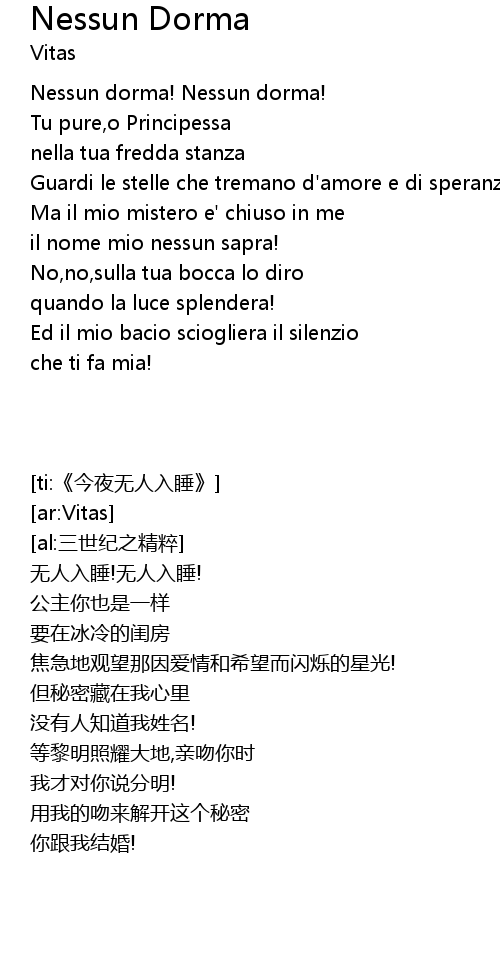 | [00:04.83] | Nessun dorma! Nessun dorma! |
