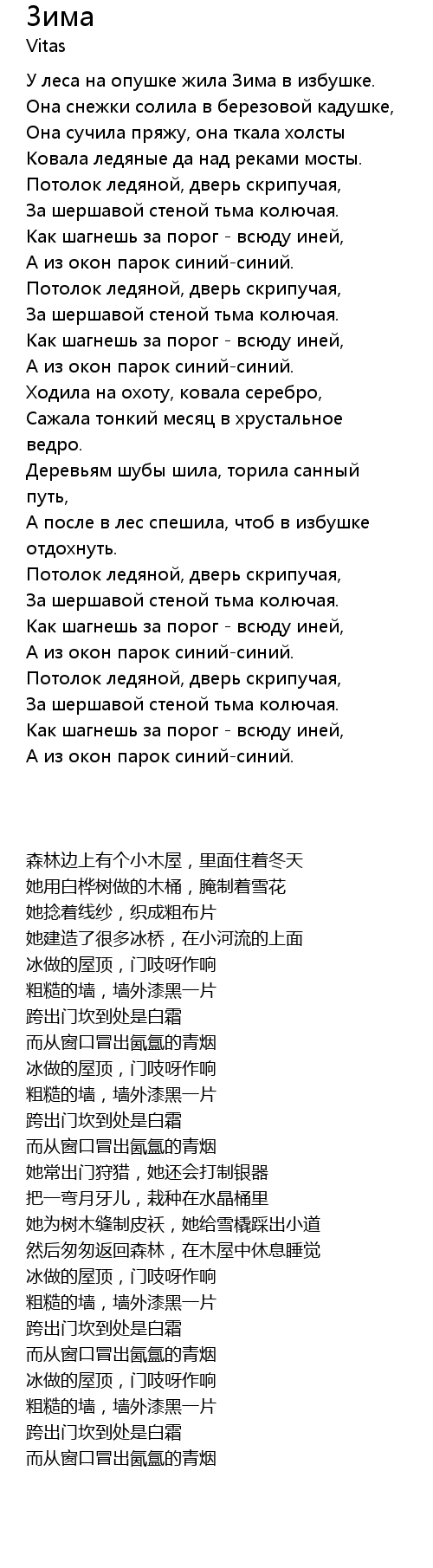 | [00:32.56] | У леса на опушке жила Зима в избушке. |
