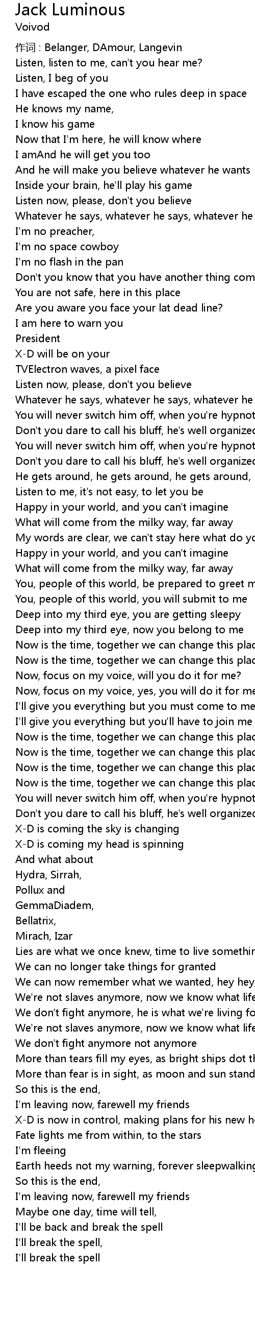 | 作词 : Belanger, DAmour, Langevin | |