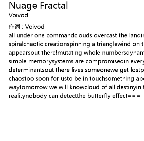 | all under one commandclouds overcast the landinfinite divisionpatterns of flat spiralchaotic creationspinning a trianglewind on the schizospherenuage fractal appearsout there!mutating whole numbersdynamic intruderviruses organizeone simple memorysystems are compromisedin every theoryall random elementsbecome determinantsout there lives someonewe get lostpirate space kingdomin this chaostoo soon for usto be in touchsomething about the codesalvation's on it's waytomorrow we will knowcloud of all destinyin the light of todayghost of realitynobody can detectthe butterfly effect=== |