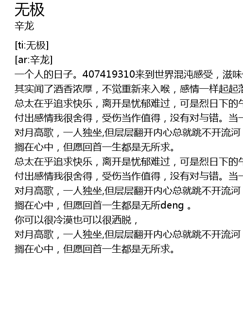 | [00:45.48] | 一个人的日子。407419310来到世界混沌感受,滋味像一口酒, |