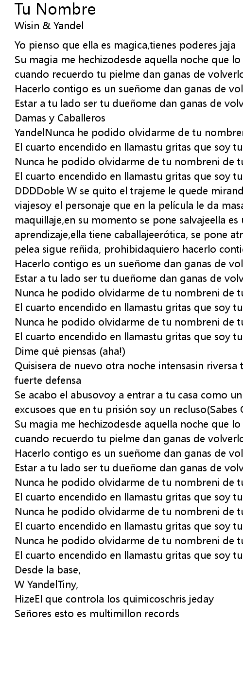 | Su magia me hechizodesde aquella noche que lo hicimossiento que, me enamoro cuando recuerdo tu pielme dan ganas de volverlo hacer Yandel | |