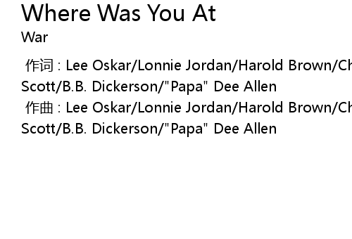 | [00:00.000] | 作词 : Lee Oskar/Lonnie Jordan/Harold Brown/Charles Miller/Howard Scott/B.B. Dickerson/"Papa" Dee Allen |