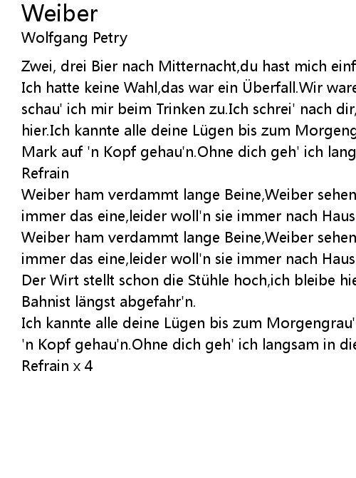 | Weiber ham verdammt lange Beine,Weiber sehen tierisch gut aus.Weiber wollen immer das eine,leider woll'n sie immer nach Haus. | |