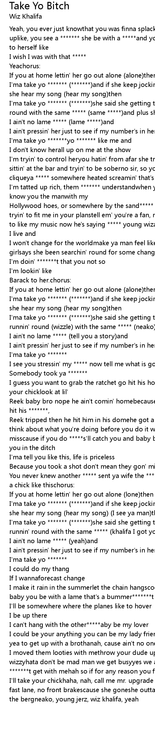 I'ma take yo ******* (*******)she said she getting tired (neako) of fightin' and runnin' round with the same ***** (khalifa I got you bro)and plus she know |