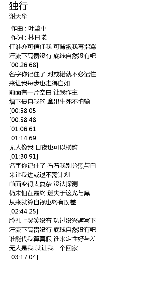 [02:12.41][00:58.48] rèn shuí yì kě xìn rèn wǒ kě bèi pàn wǒ zài zhǐ mà