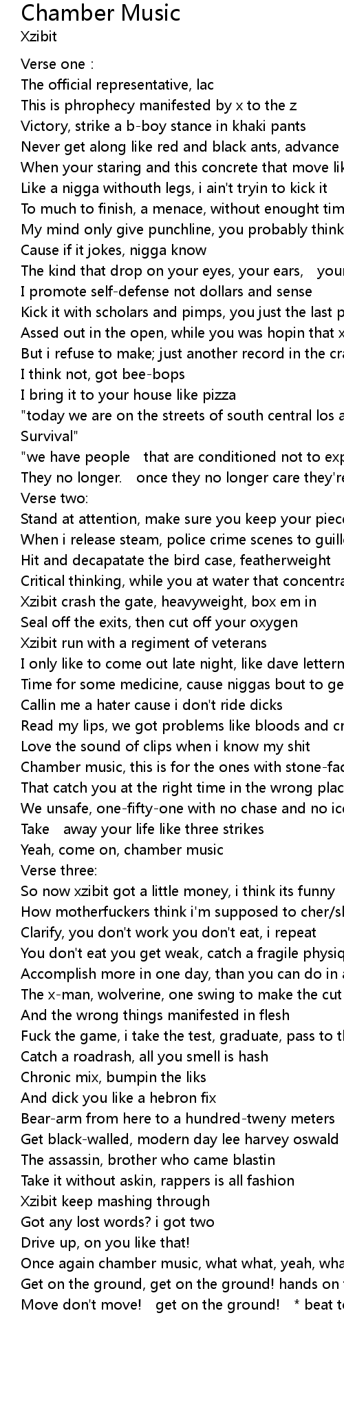 | Once again chamber music, what what, yeah, what the deal? it' s xzibit. | |