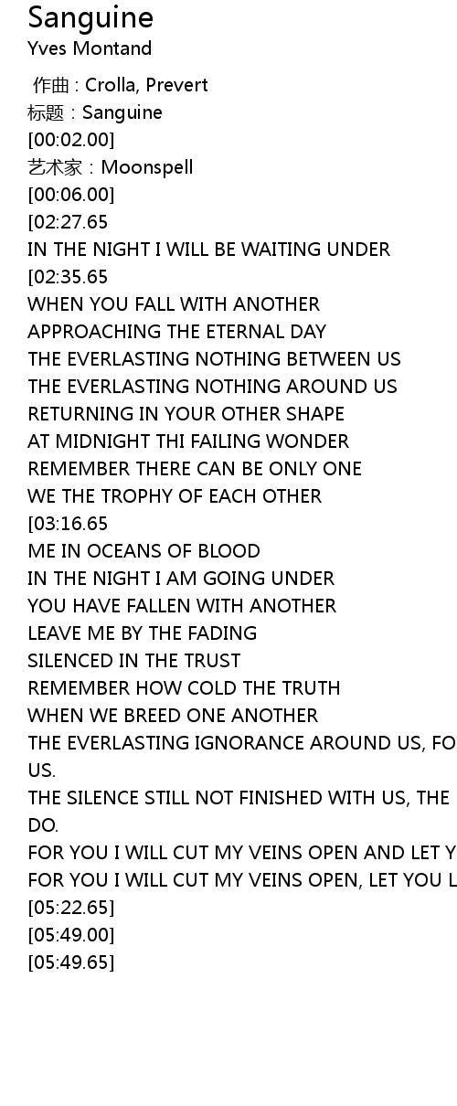 | [01:38.65][03:16.65][05:06.65][05:14.65][05:30.65] | SANGUINE YOUR LOVE COMES TO ME IN OCEANS OF BLOOD |
