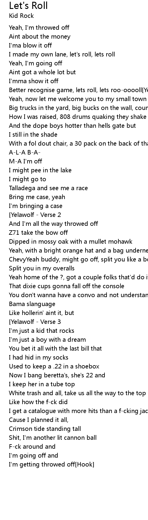 | Better recognise game, lets roll, lets rooooooll Yelawolf Verse 1 | |