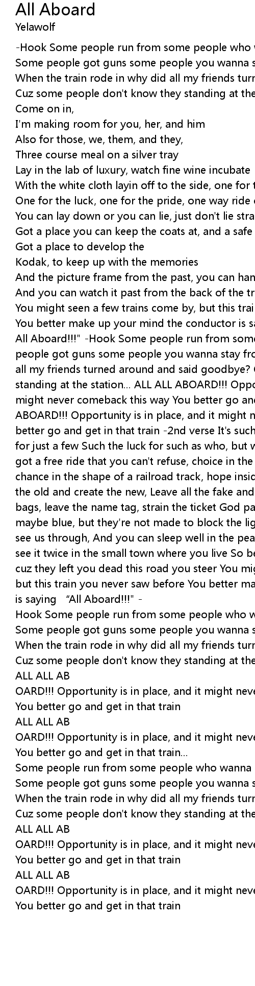 | All Aboard!!!" Hook Some people run from some people who wanna save ' em Some people got guns some people you wanna stay from When the train rode in why did all my friends turned around and said goodbye? Cuz some people don' t know they standing at the station... ALL ALL ABOARD!!! Opportunity is in place, and it might never comeback this way You better go and get in that train ALL ALL ABOARD!!! Opportunity is in place, and it might never comeback this way You better go and get in that train 2nd verse It' s such a view, but it' s reserved for just a few Such the luck for such as who, but who is me and who is you You got a free ride that you can' t refuse, choice in the form of a new caboose A chance in the shape of a railroad track, hope inside make the move Break from the old and create the new, Leave all the fake and replace the true Pack the bags, leave the name tag, strain the ticket God payed for you Trade for blim and maybe blue, but they' re not made to block the light The light from the sun will see us through, And you can sleep well in the peace of night, Cuz you might not see it twice in the small town where you live So believe in the right to life cuz they left you dead this road you steer You might seen a few trains come by, but this train you never saw before You better make up your mind the conductor is saying " All Aboard!!!" | |