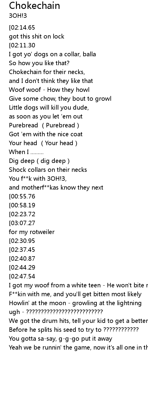 | [03:17.18][02:37.45][01:18.59] | Got a - Chokechain (ch-ch-chokechain) |