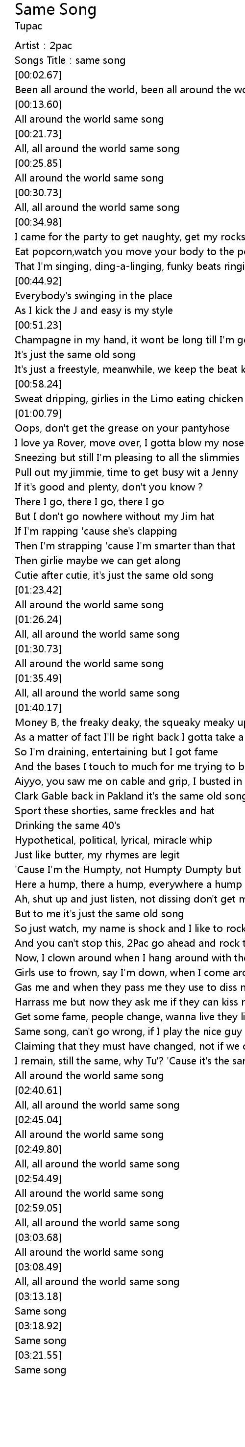 | [02:36.68] | I remain, still the same, why Tu'? ' Cause it' s the same song |