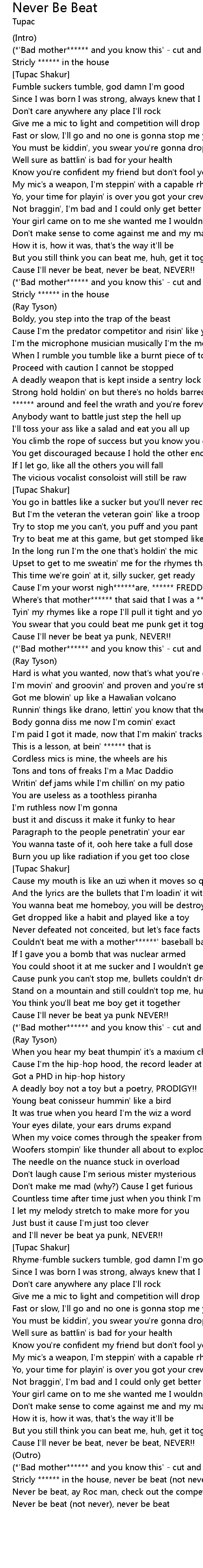 Cause I'll never be beat, never be beat, NEVER!! |