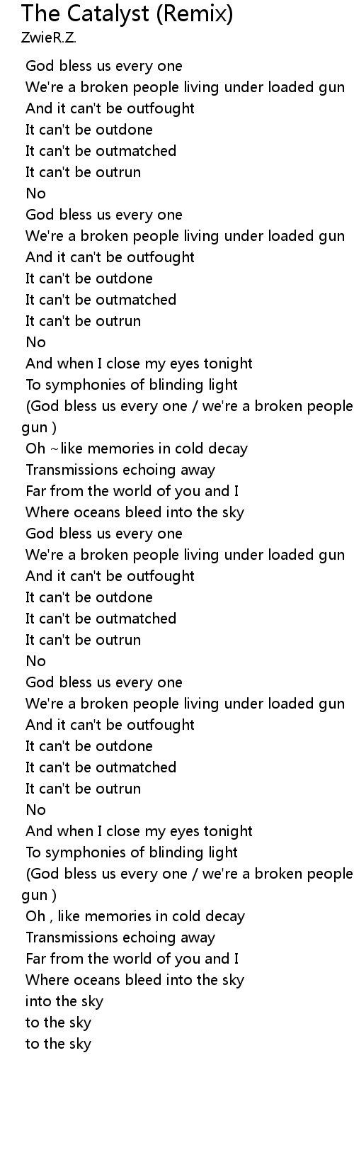 | [00:56.424] | (God bless us every one / we're a broken people living under loaded gun) |