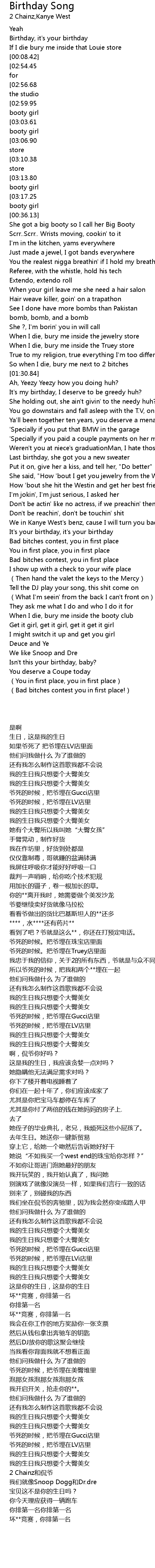 | [04:12.04][03:03.61][01:41.33][00:19.30] | All I want for my birthday is a big booty girl |
