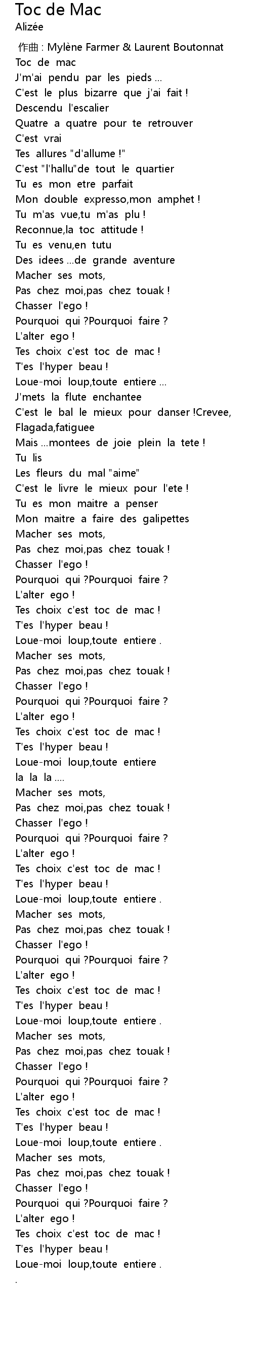 | [02:59.99] | Tes choix c' est toc de mac ! |