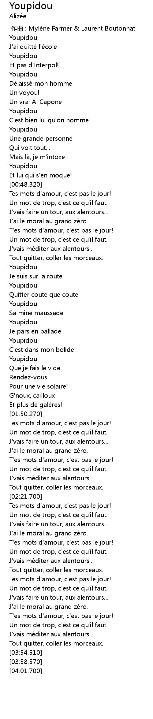 | [02:52.210] | Tes mots d'amour, c'est pas le jour! |