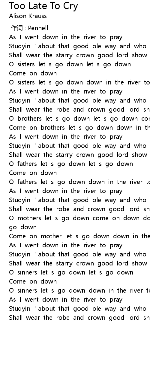 | [00:23.89] | O sisters let s go down down in the river to pray |
