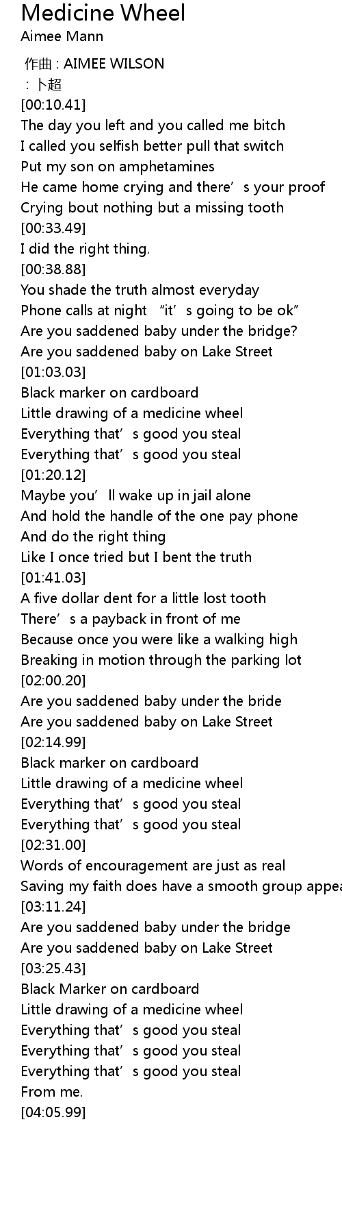 | [00:57.36] | Are you saddened baby on Lake Street |