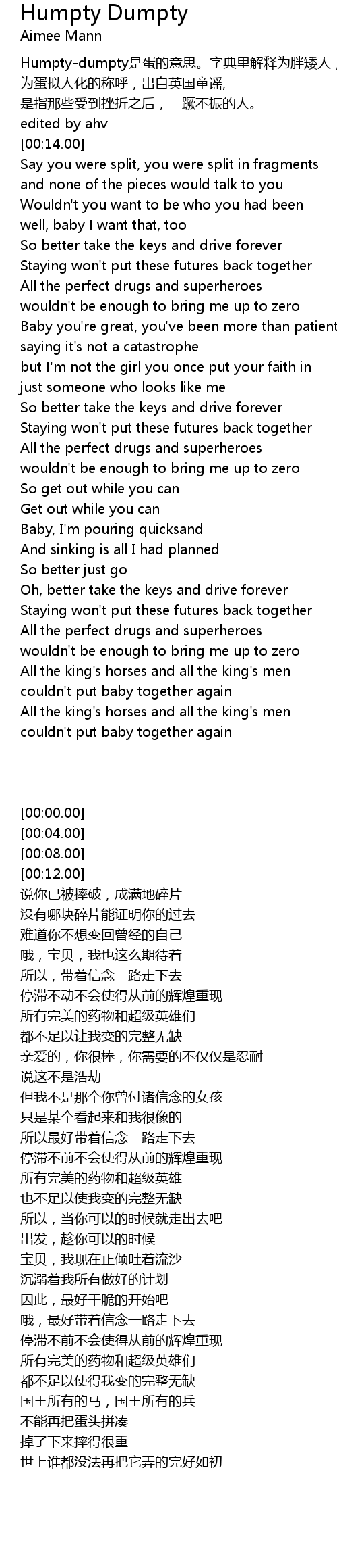 | [00:00.00] | Humptydumpty shi dan de yi si. zi dian li jie shi wei pang ai ren, |