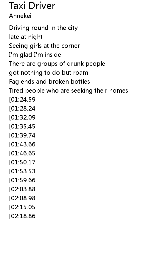 | [03:25.05][01:53.53] | Driving a taxi at night |