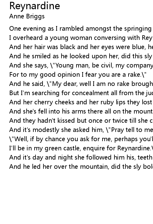 And he led her over the mountain, did the sly bold Reynardine. |