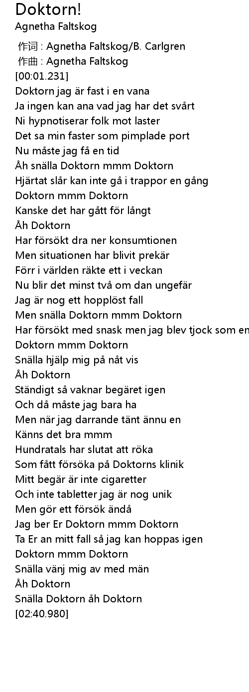 | [02:05.476] | Jag ber Er Doktorn mmm Doktorn |