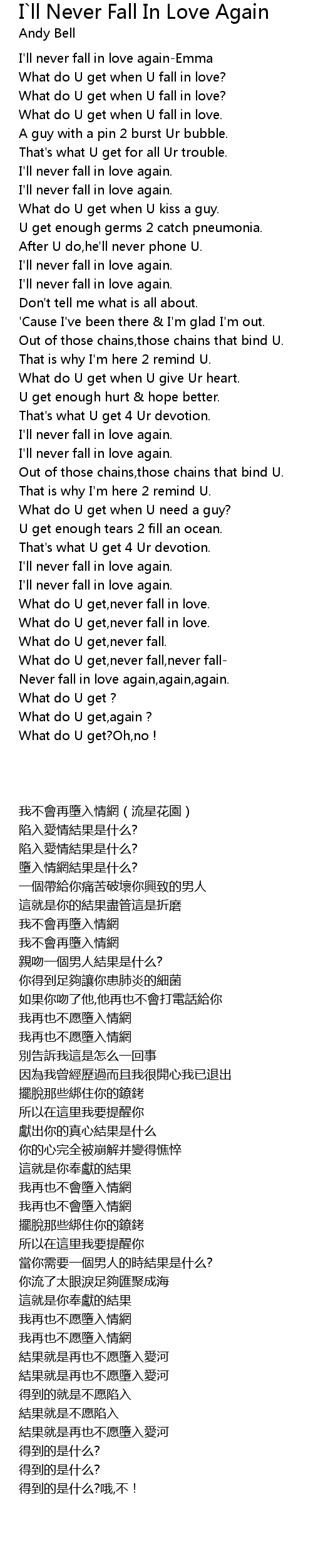 What do U get,never fall in love. |